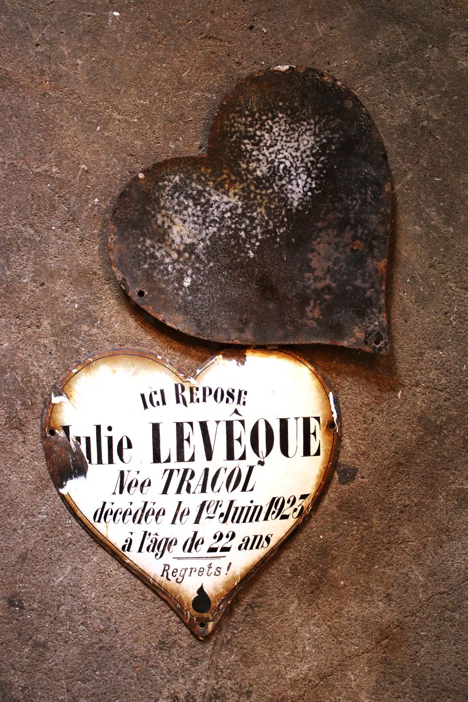 Dekorative , gamle franske minde hjerter i jern og emalje med skrift med patina tilbage fra år 1923 / 1925.