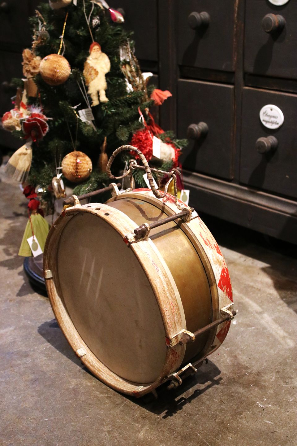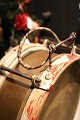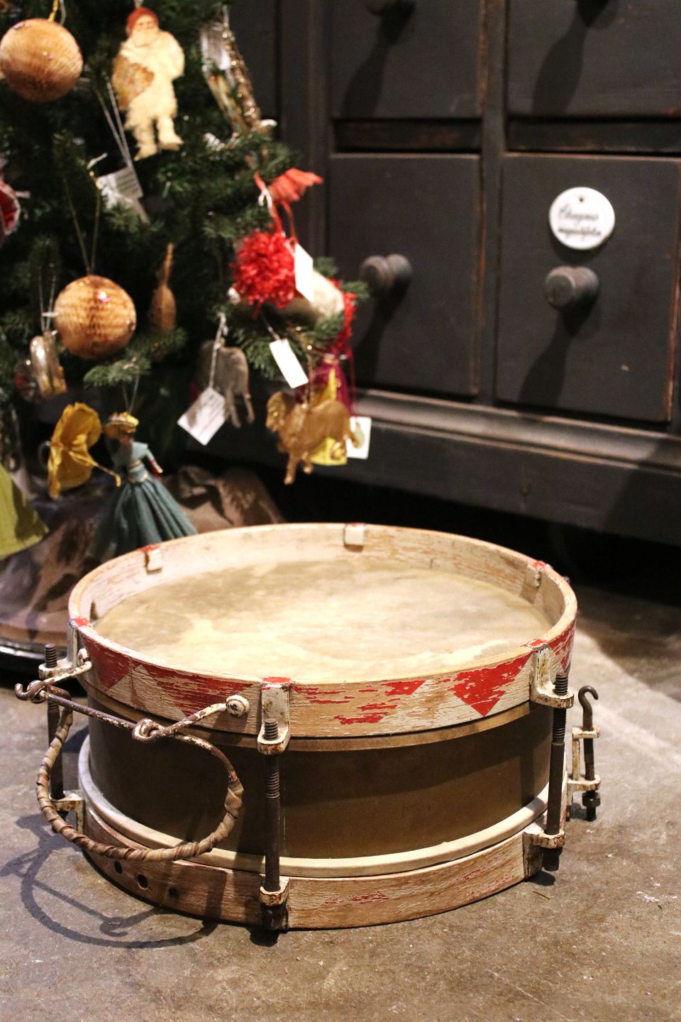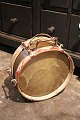 Dekorativ , gammel tromme i messing med malet træ kanter (Rød / Hvid) og har en rigtig fin patina. H: 14cm. Dia.: 35cm. Emne nummer: Tromme nr.4