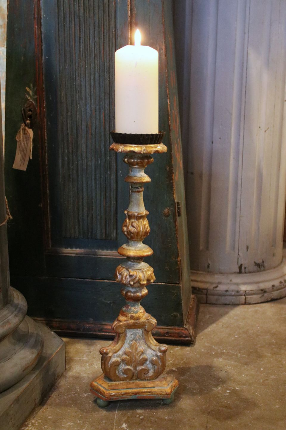 Antik , fransk 1800 tals lysestage i udskåret træ med original bemaling og med en rigtig fin patina. Højde: 44cm.