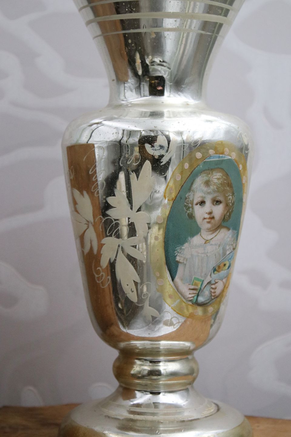 Antik , 1800 tals vase i fattigmandssølv , dekoreret med bemalet blad ranker og håndmalet portræt billede af en lille pige med en slikpose.