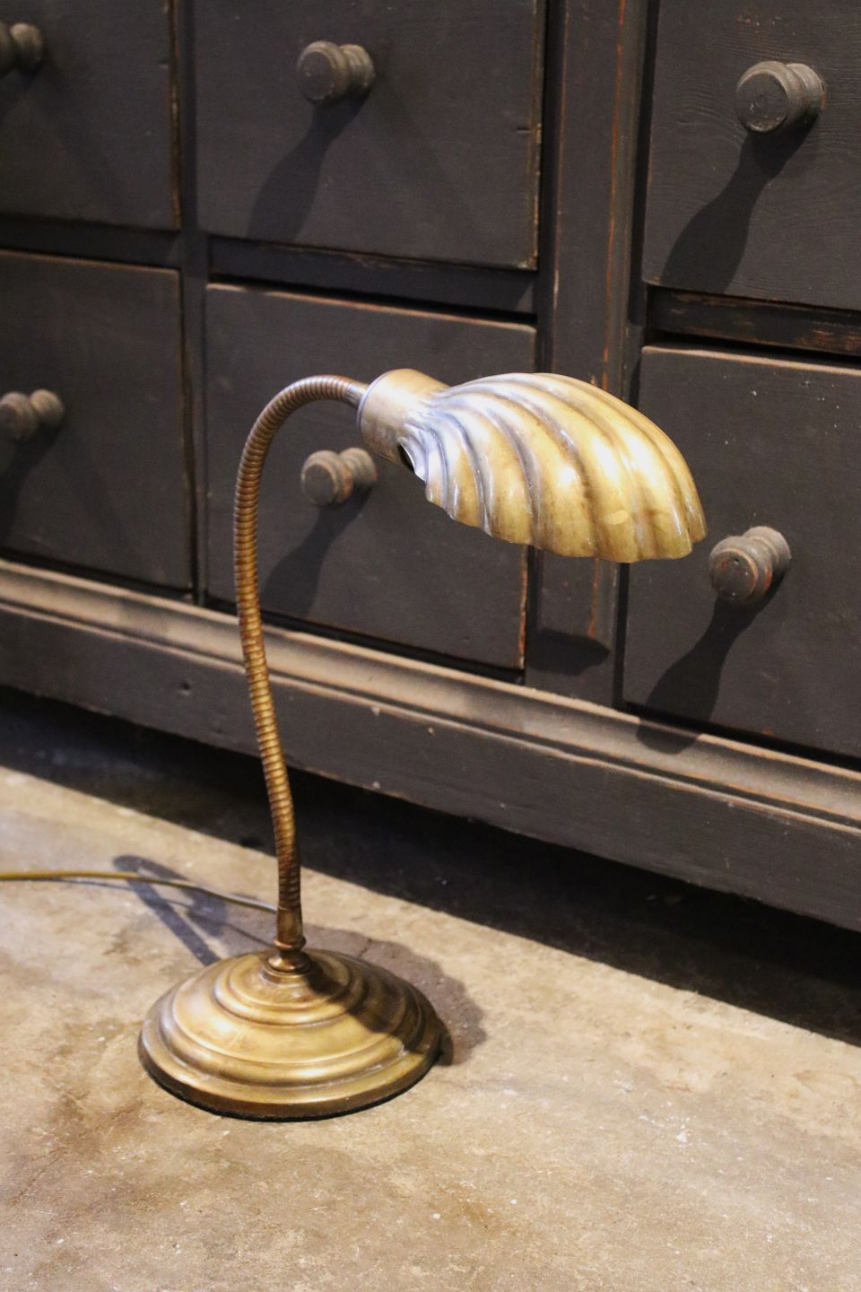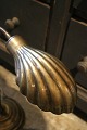 Gammel bordlampe i messing med musling formet skærm. Ca. H: 40cm. Lampen er monteret med ny ledning og afbryder.
