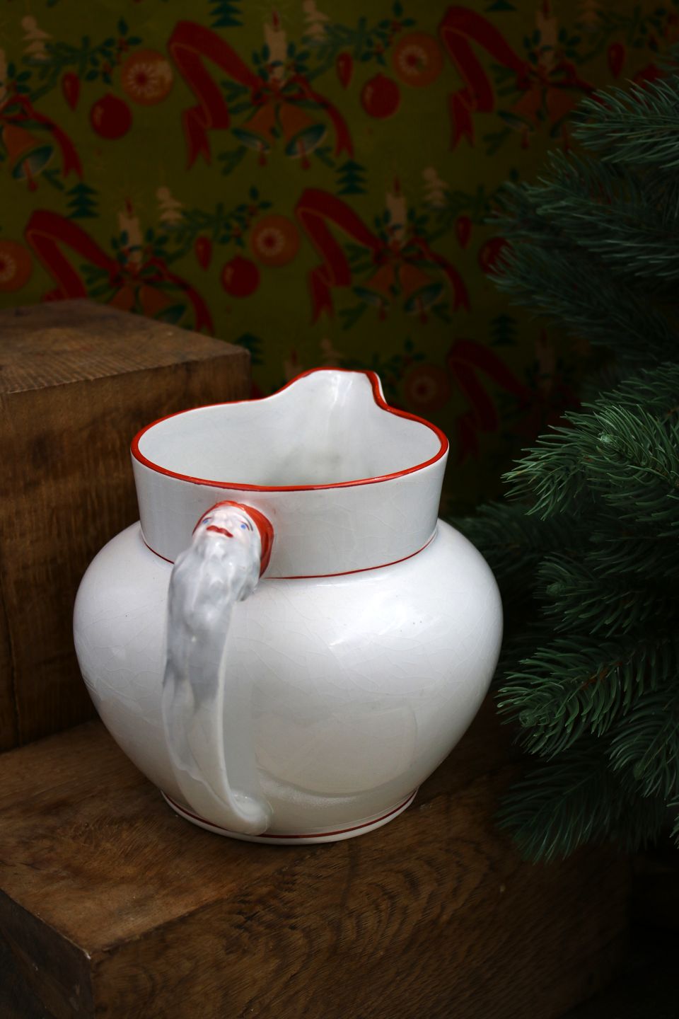 STOR gammel svensk "Herregårds" julekande i fajance med nisser på hældetuden og på hanken. H:15m. Dia.: 17cm. L: 22cm.