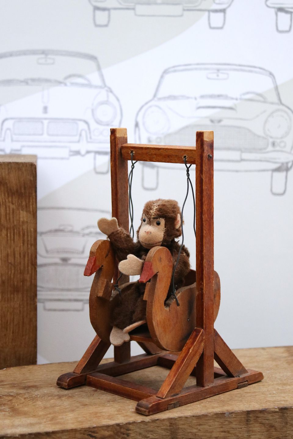 Sød , lille plys abe siddende i gammel træ gynge. Gynge H: 18,5cm. 12x9cm. Abe H: 11cm. Emne nummer: Abe i gynge