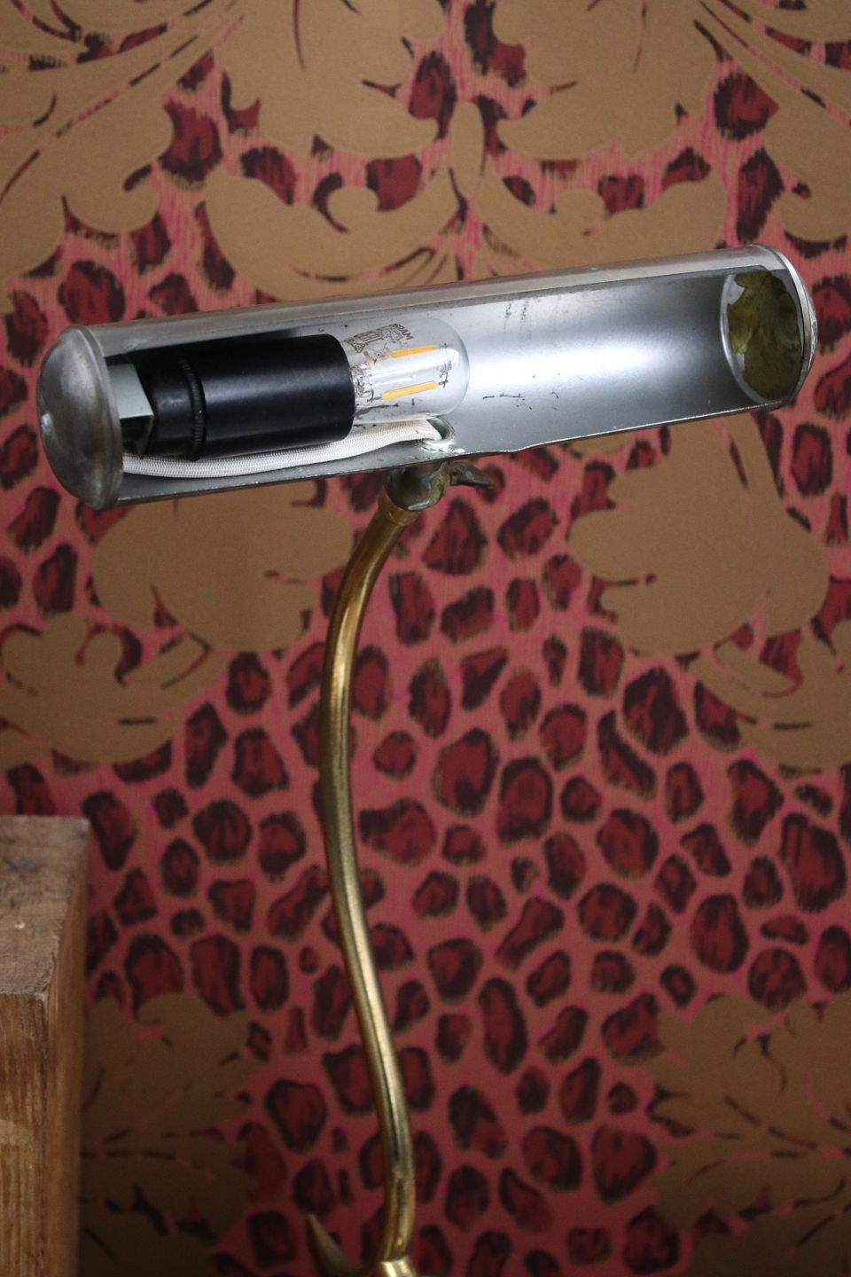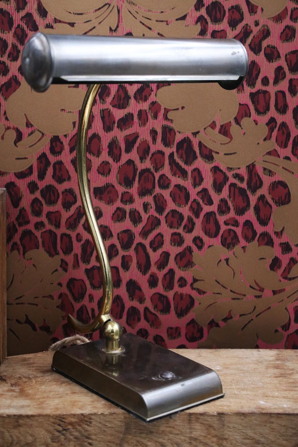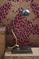 Gammel skrivebordslampe i patineret messing. H: 31cm. Skærm Dia.: L: 20,5cm. Dia.: 4,5cm.