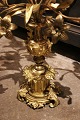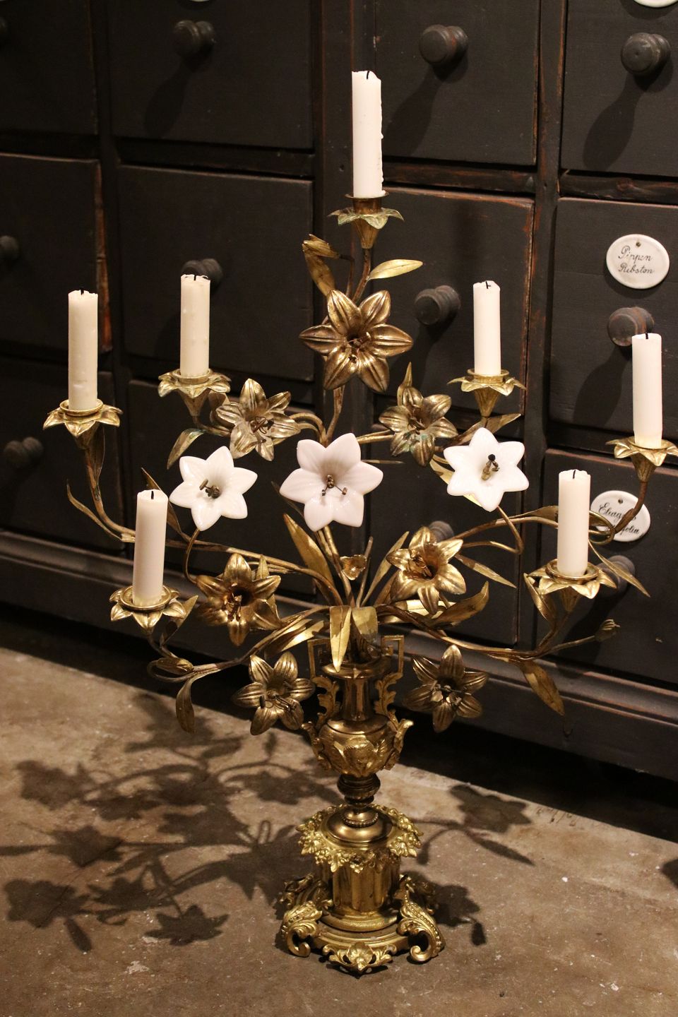 Stor flot fransk kirkelysestage i bronze , dekoreret med bronze liljer og 3 gamle hvide opaline glas liljer , samt med en meget flot fod med engel.