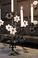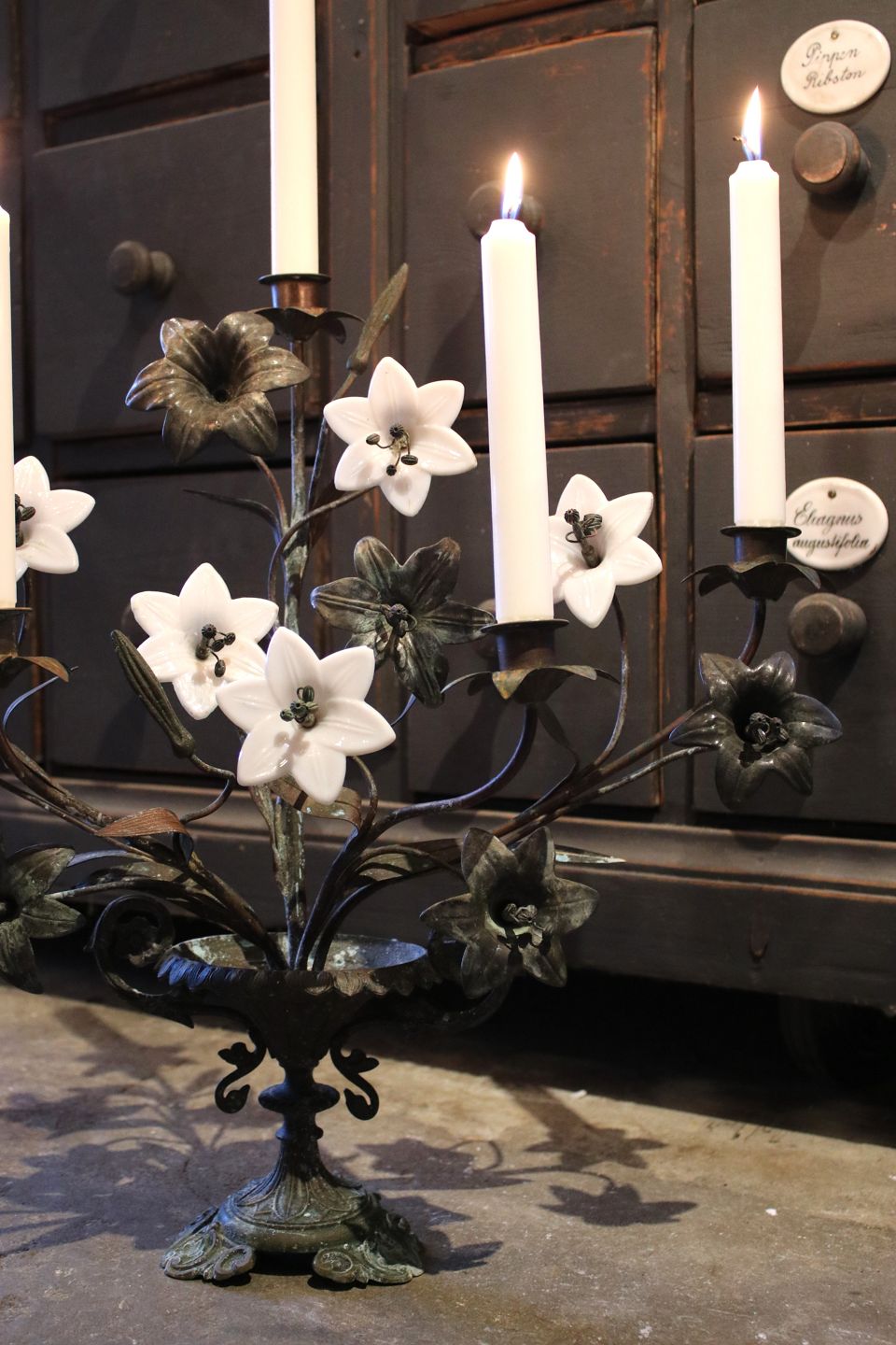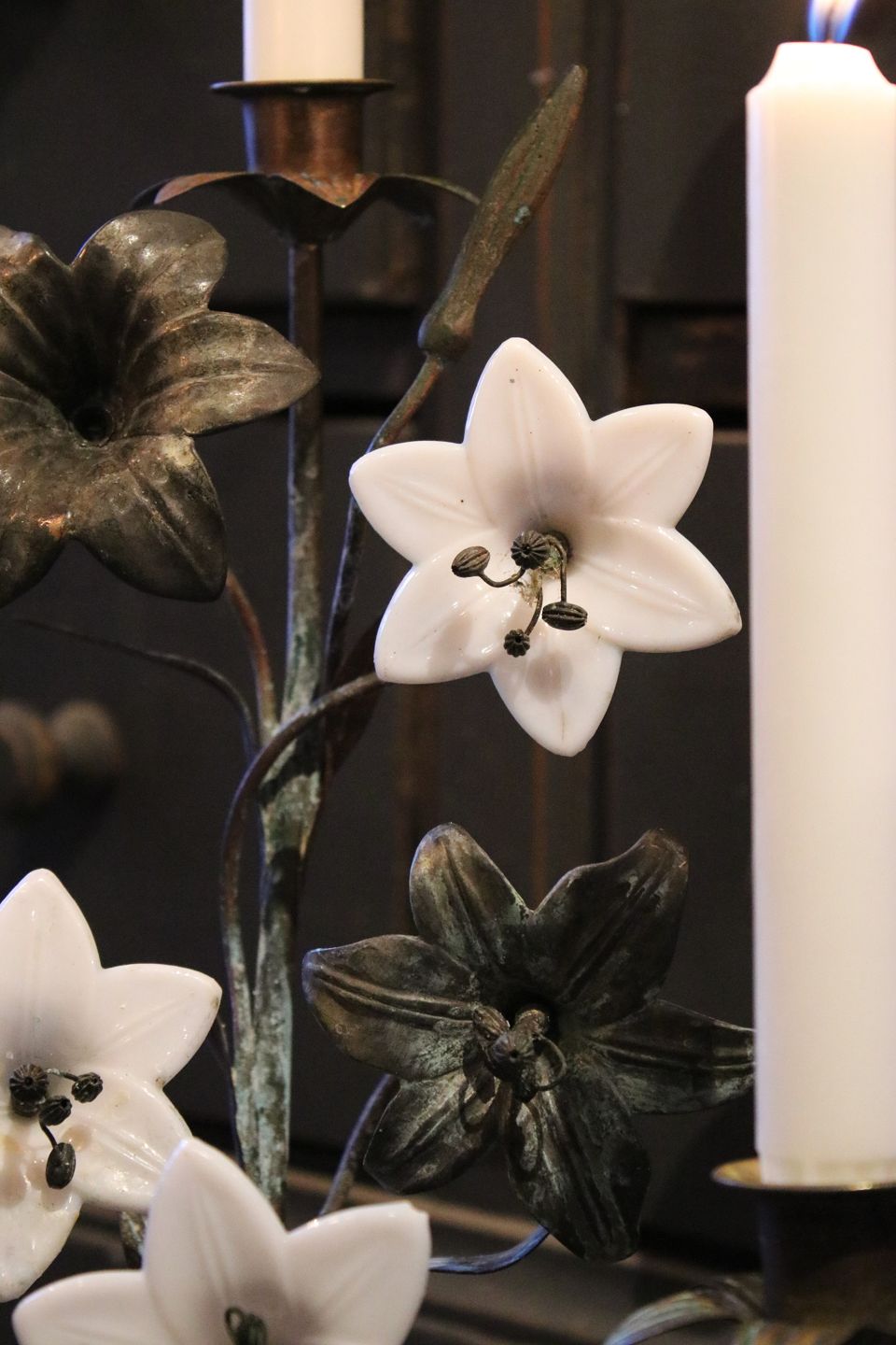 Antik fransk kirkestage i helt mørk patina , dekoreret med blandt andet 5 gamle hvide opal glas blomster og fin vase formet fod.