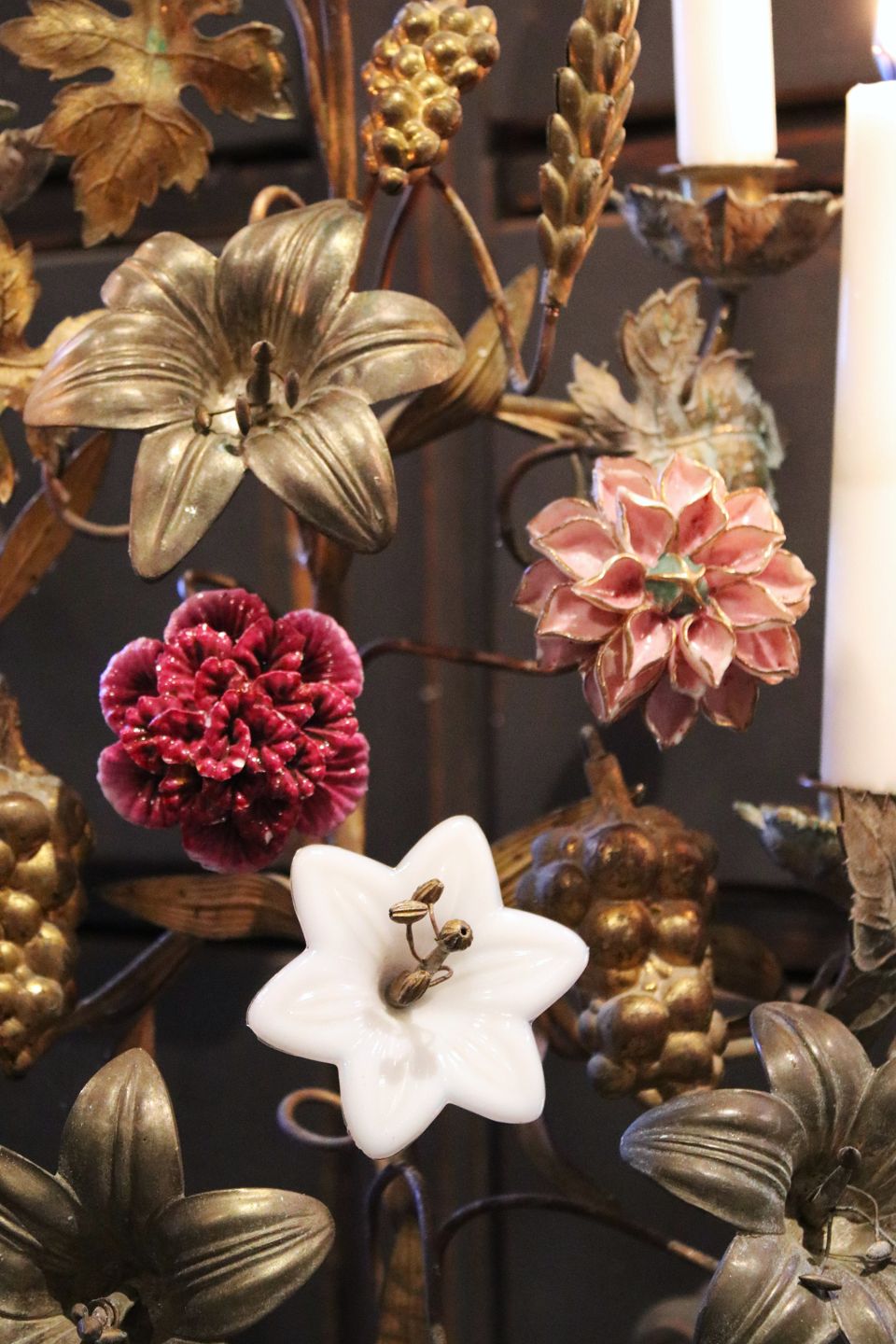 Lysestagen har plads til 7 stearinlys og er dekoreret med 2 fine farvet porcelæns blomster , 1 hvid opal glas blomst , drueklaser , kornneg , vinblade og store lilje blomster i bronze.