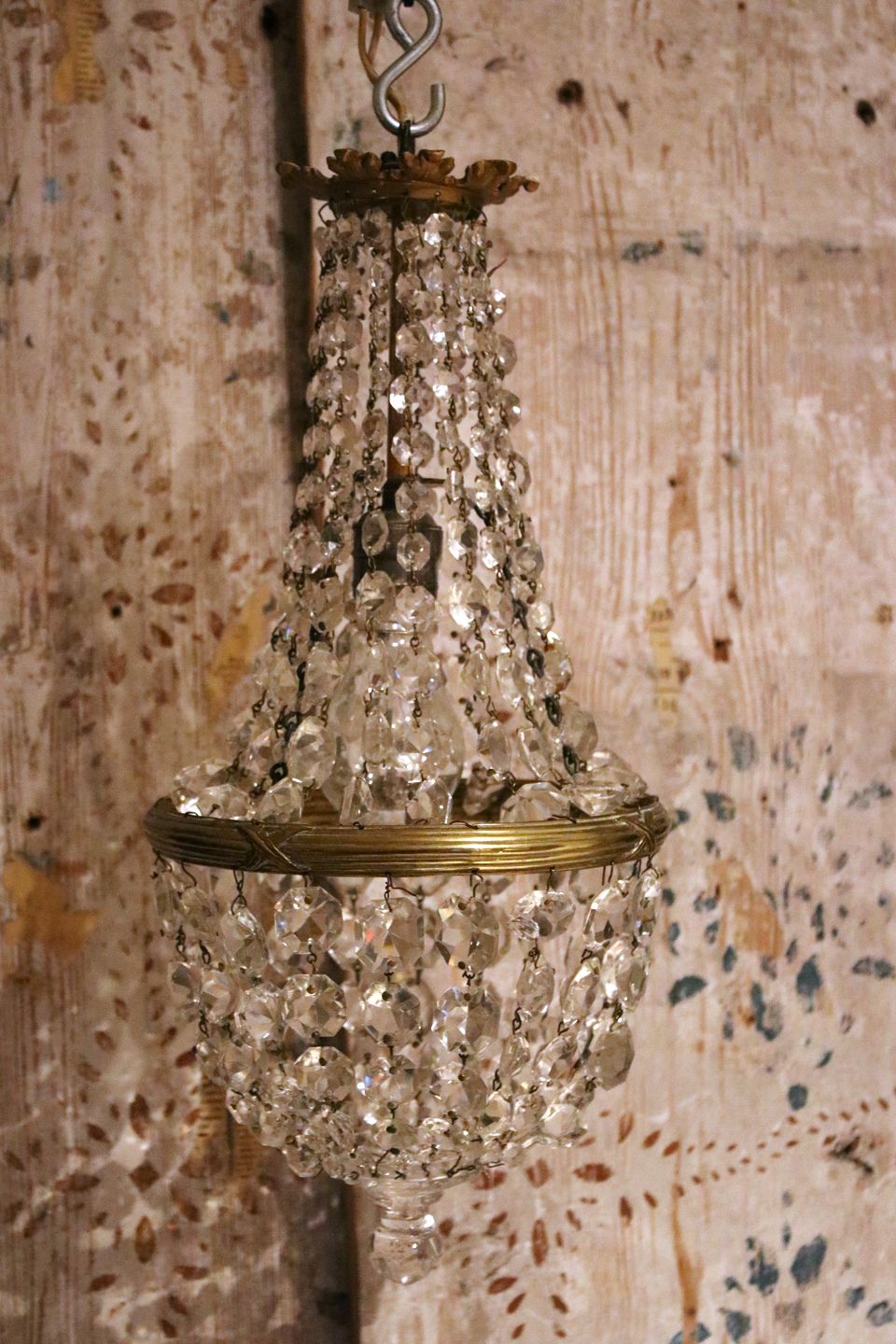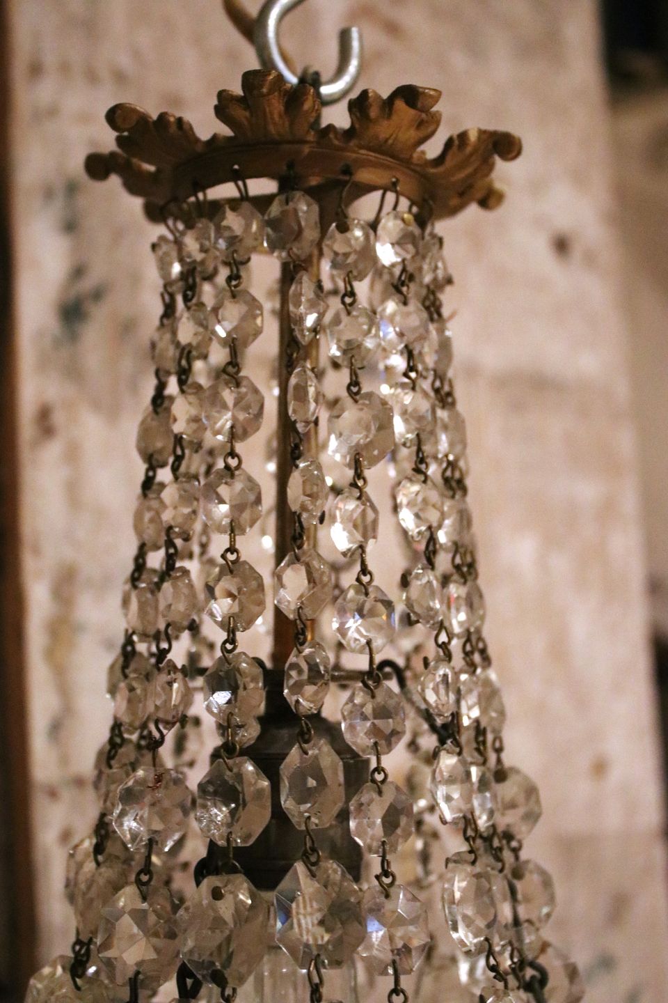 Gammel , mini prismelysekrone i bronze med klare slebne glas prismer.