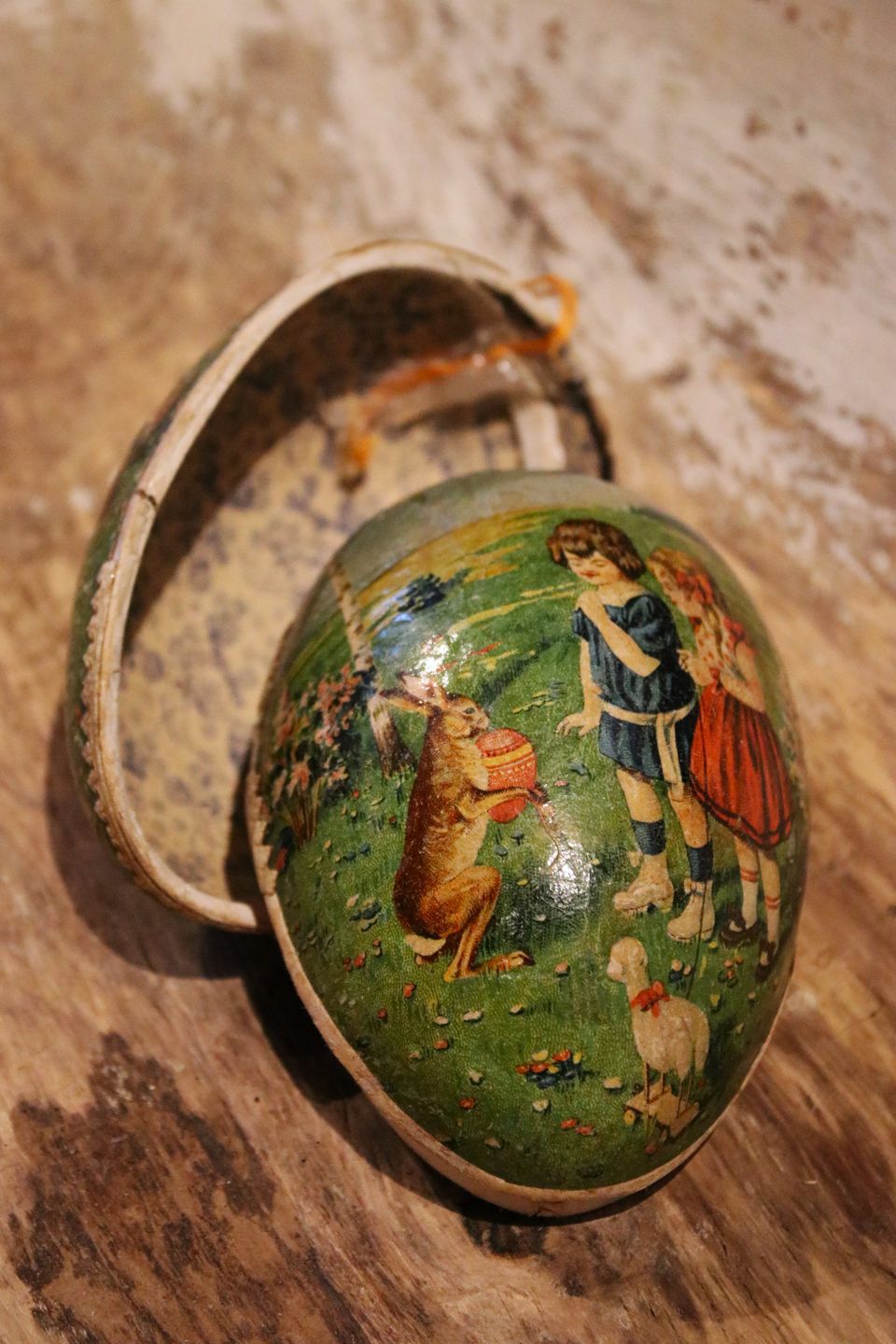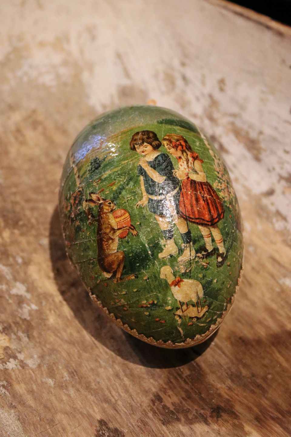 Gammelt påskeæg i papmache fra begyndelsen af 1900 tallet med motiv af lille dreng og pige med påskehare. Højde: 11,5cm. Emne nummer: Påskeæg nr.1
