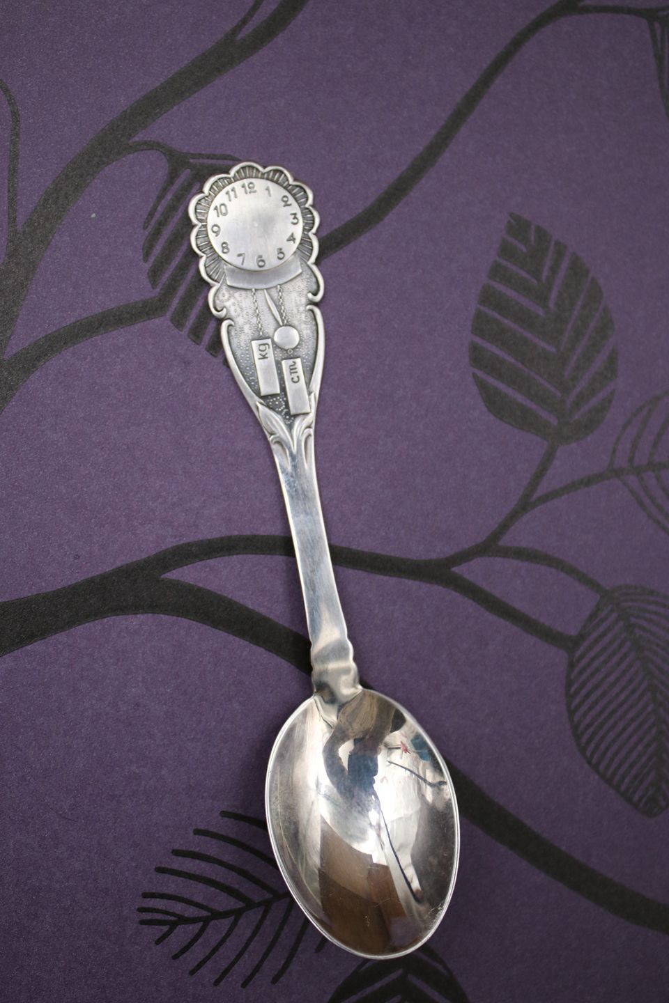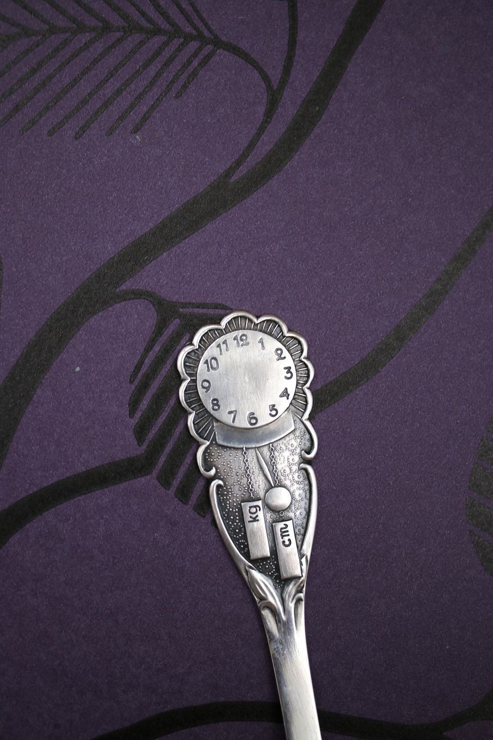 Barneske i sølv (stemplet) med motiv af urskive , hvor det er muligt at få fødselstidpunkt , vægt og cm. indgraveret. L: 13,8cm. 32.8 gram.