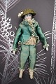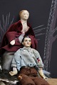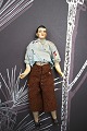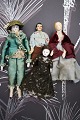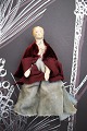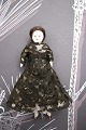 1) H: 19cm. Dame med hoved , hænder og fødder i porcelæn , krop i stof og iklædt gammelt silketøj og hat. - PRIS: 700 Kr.