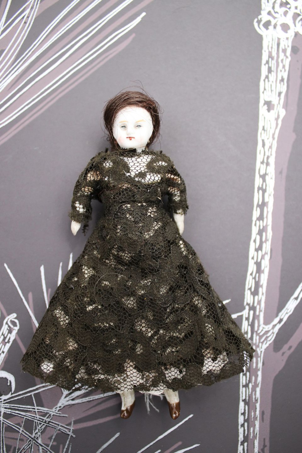 2) H: 13,5cm. Pige med hoved , hænder og fødder i porcelæn , krop i stof og iklædt gammel blondekjole - PRIS: 500 Kr.