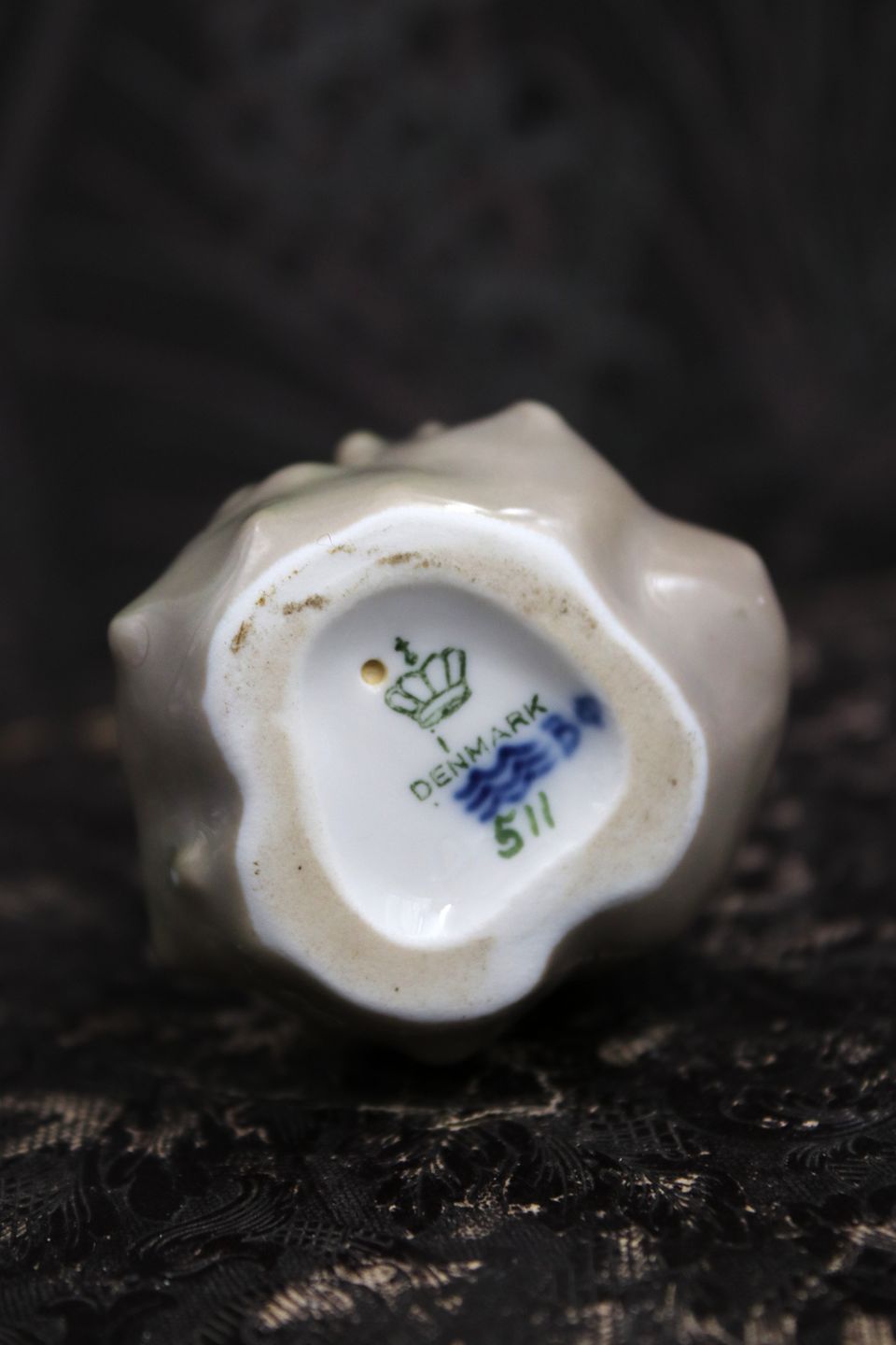 Lille hvid mus siddende på en kastanje , fin lille porcelænsfigur fra Royal Copenhagen. H: 6,5cm. Dekorationsnummer: RC511. fra 1893-1900.