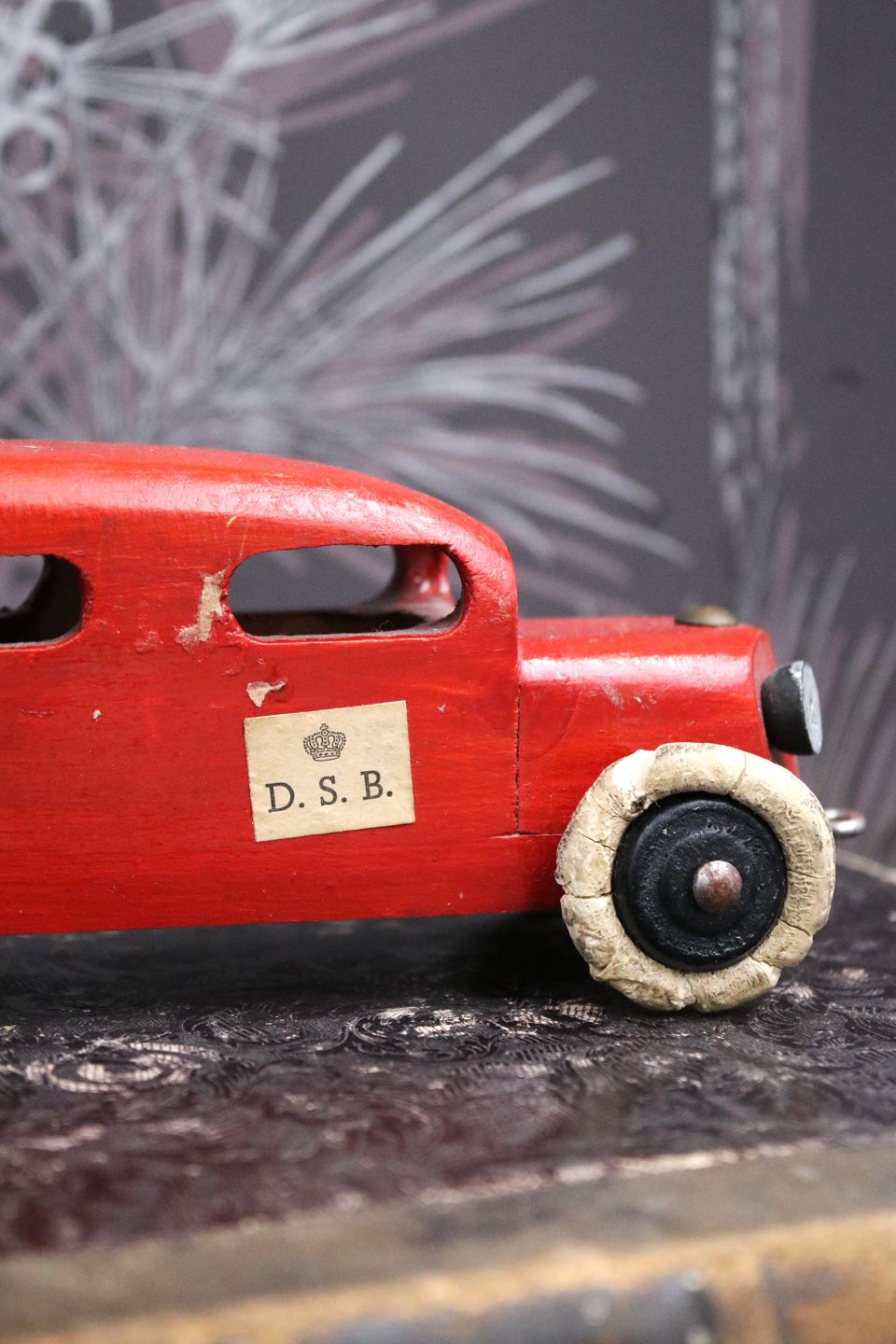 Dekorativ, gammel vintage rutebil i rødmalet træ med DSB skilt på døren og en fin gammel patina. H: 6,5cm. L: 22,5cm. Emne nummer: Vintage træ bil