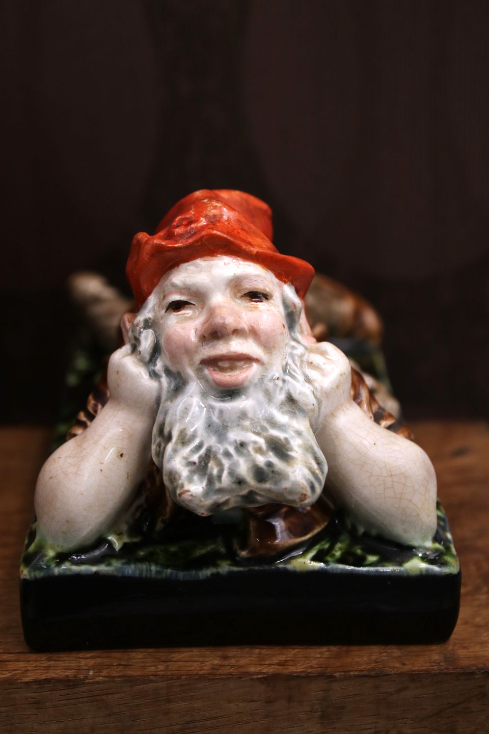 Antik , tysk keramik nisse i fin majolica glasur fra ca. 1880. H: 9cm. L: 17cm. B: 9cm.