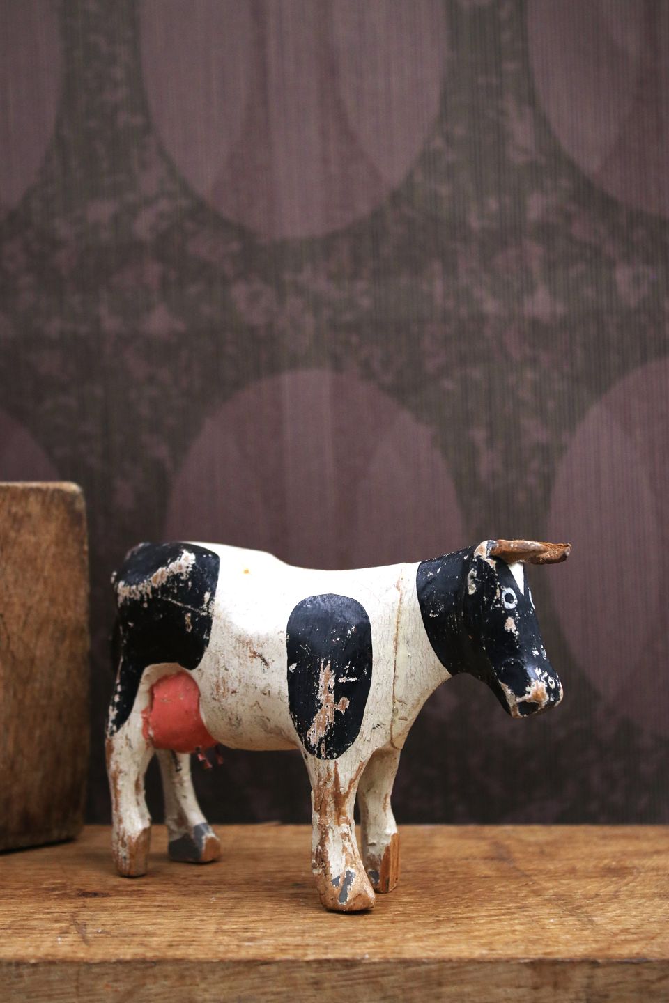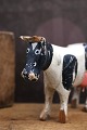 Dekorativ , gammel malkeko i udskåret træ med fin original bemaling , horn og hale i læder. H: 9cm. L: 13,5cm.