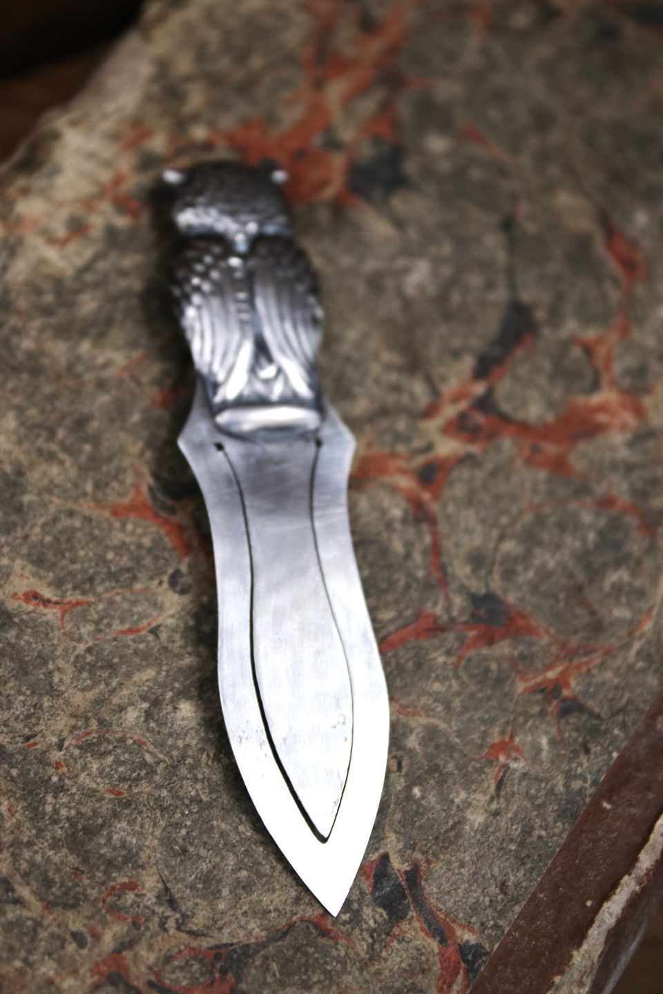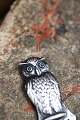 Gammelt bogmærke i sølv i form af en lille ugle med grønne glas øjne. Stemplet 830s. Længde: 8,6cm. Emne nummer: Bogmærke sølv nr.2