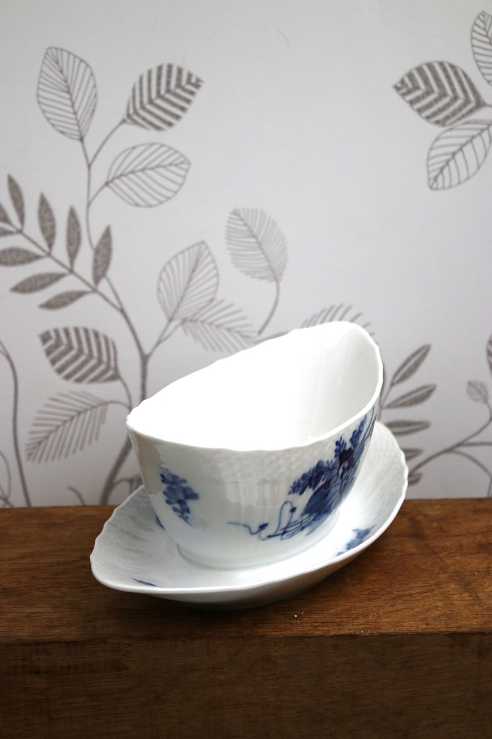Royal Copenhagen Blå Blomst svejfet oval sovseskål på fast underfad.